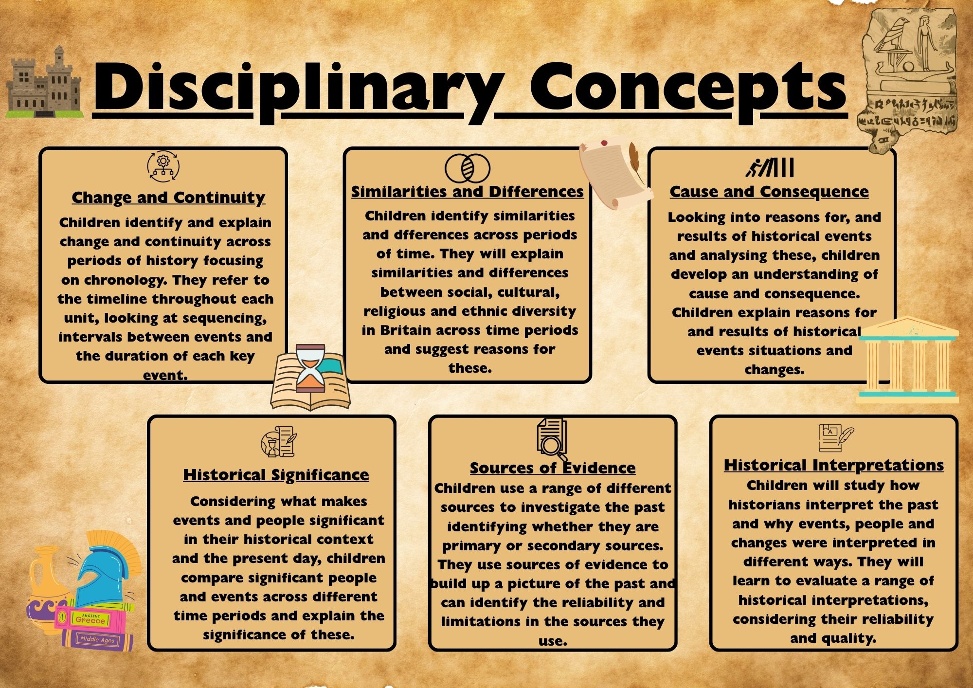 Our progression of knowledge and skills clearly shows how these concepts grow in complexity from Early Years through to Year 6. By revisiting ideas more than once and in new historical periods, children can identify how each concept changes depending on time, place and culture.